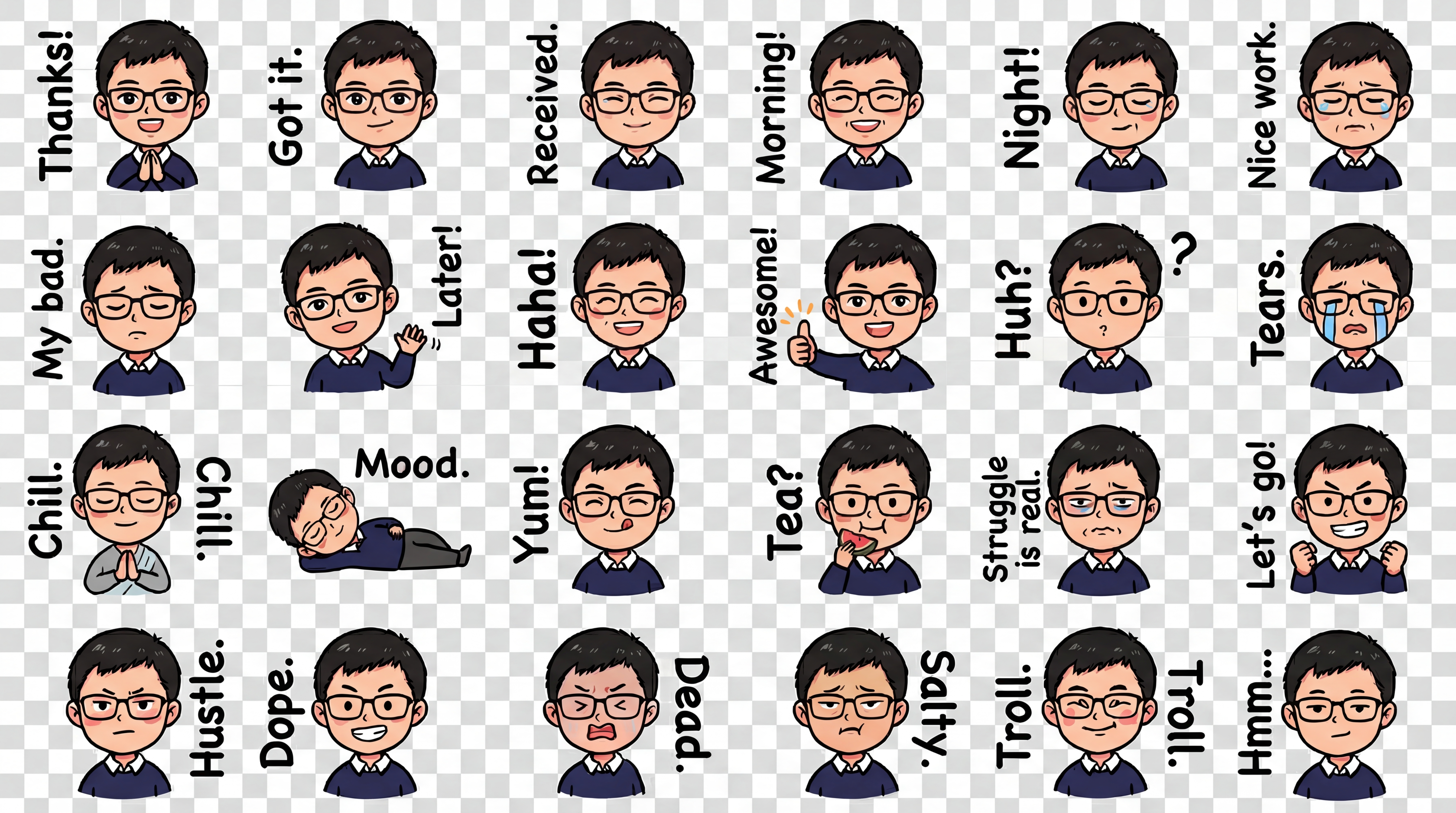 Produce a chibi-style LINE-inspired half-body character sticker set. Preserve the character’s correct headwear. Use a colored hand-drawn aesthetic. Create a 4×6 layout containing a wide range of common chat phrases and relevant entertainment memes. Do not replicate the source image. All text must be handwritten American English. Final output images must be 4K resolution at 16:9.