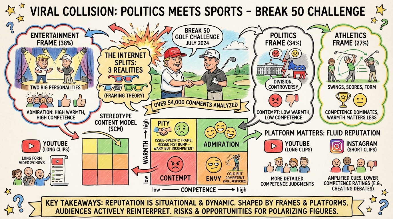 Our study on Donald Trump’s appearance in Break 50 revealed that such intersections did not just generate attention: they sparked a kaleidoscope of interpretations shaped by framing and stereotype perceptions. On YouTube and Instagram, the same event was framed alternately as entertainment, controversy, or athletic performance, each producing strikingly different evaluations of Trump.