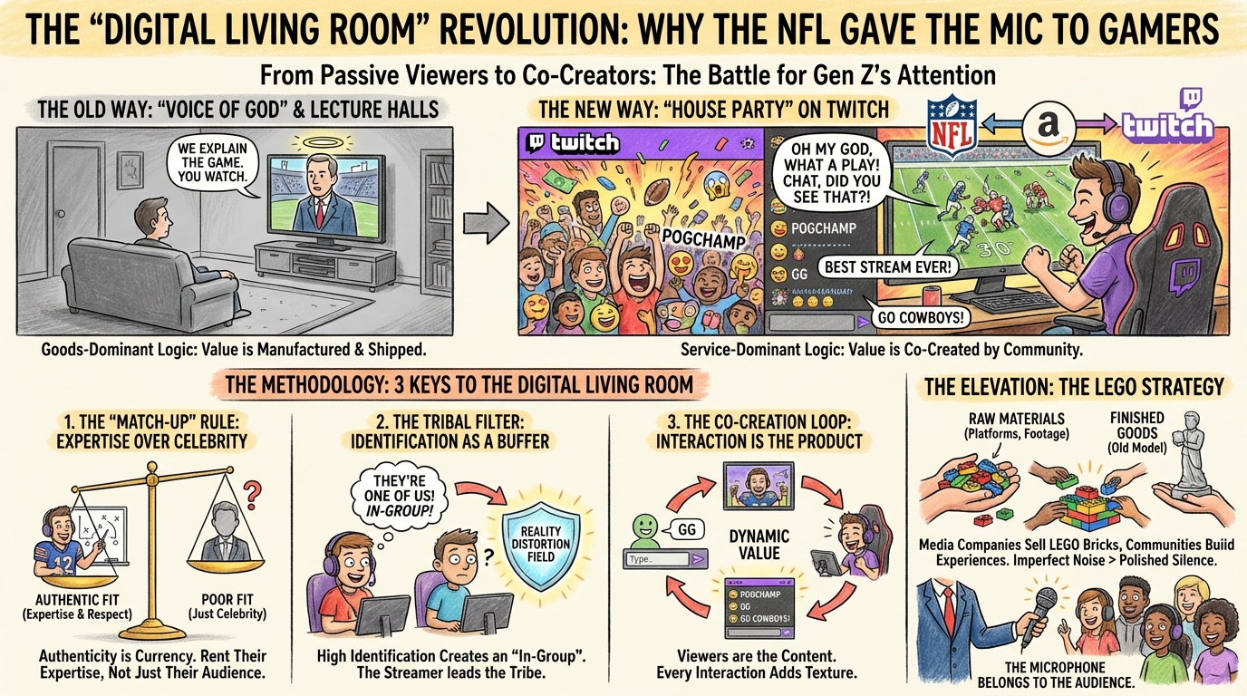 An emerging form of social media service, social live streaming, has been increasingly adopted by sports organizations to foster fan engagement. The National Football League (NFL) is no exception to this trend as it collaborates with Twitch, one of the most popular live streaming platforms, to broadcast Thursday Night Football (TNF). By leveraging Twitch’s video game personalities (streamers), the new format of sports live streaming, also known as co-streaming, allows the co-creation of TNF experience characterized by personalized commentary and ample socialization opportunities. Given the novel partnership, the current study drew from service-dominant logic (S-D logic) to examine the relationships among co-streamer expertise, co-streamer identification, co-streaming fit, virtual interactions, and continuous watching intentions. Results obtained from an empirical study on 2019 TNF co-streaming showed that both co-streaming fit and virtual interactions positively impacted continuous watching intentions. More importantly, co-streaming fit mediated the effects of co-streamer expertise and viewer identification on behavioral proclivities. Among highly identified viewers, co-streamer expertise had a greater impact on co-streaming fit. Findings gleaned from this study broadened the applicability of S-D logic and advanced the understanding of value co-creation in sports live streaming.