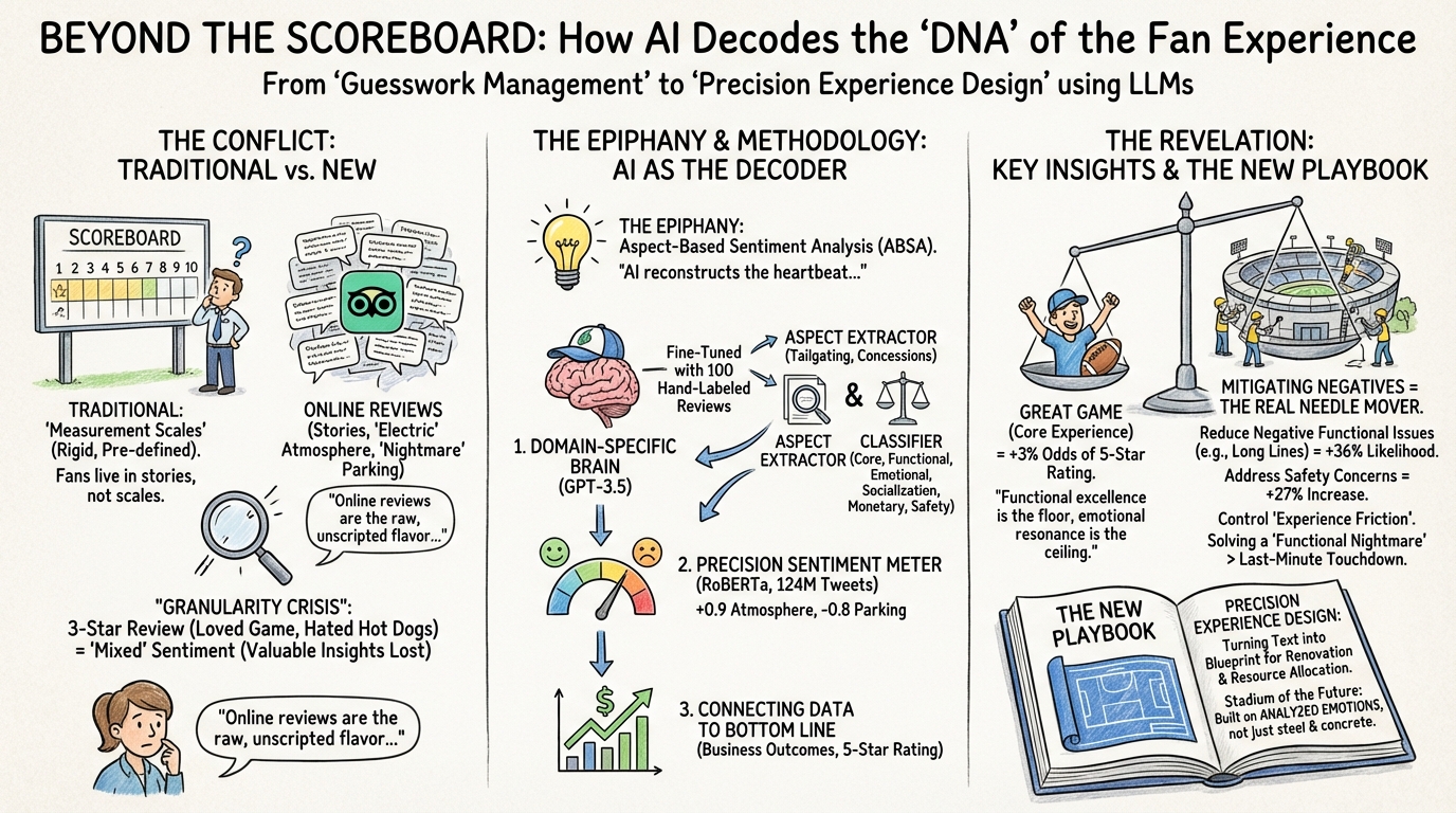 What I love here is the blend of rigor and relevance. The authors build a unified customer experience lens (core, functional, emotional, socialization, monetary, safety) and then operationalize it with an LLM pipeline: one fine-tuned GPT-3.5 to extract aspects, another to classify experiences, and a fine-tuned RoBERTa to score sentiment. That post-positivist, “qual + quant” approach turns messy fan narratives into decision-ready signals for game-day design and investment.